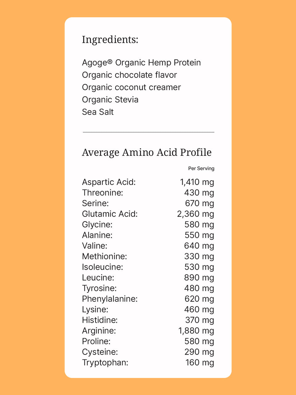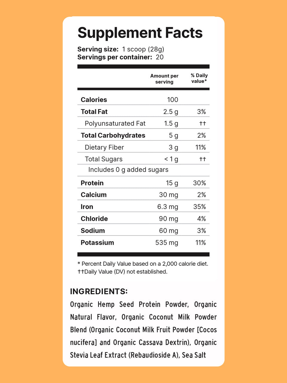 Organic Hemp Seed Protein Powder, Organic Natural Flavor, Organic Coconut Milk Powder Blend (Organic Coconut Milk Fruit Powder [Cocos Nucifera] and Organic Cassava Dextrin), Organic Stevia Leaf Extract (Rebaudioside A), Sea Salt.