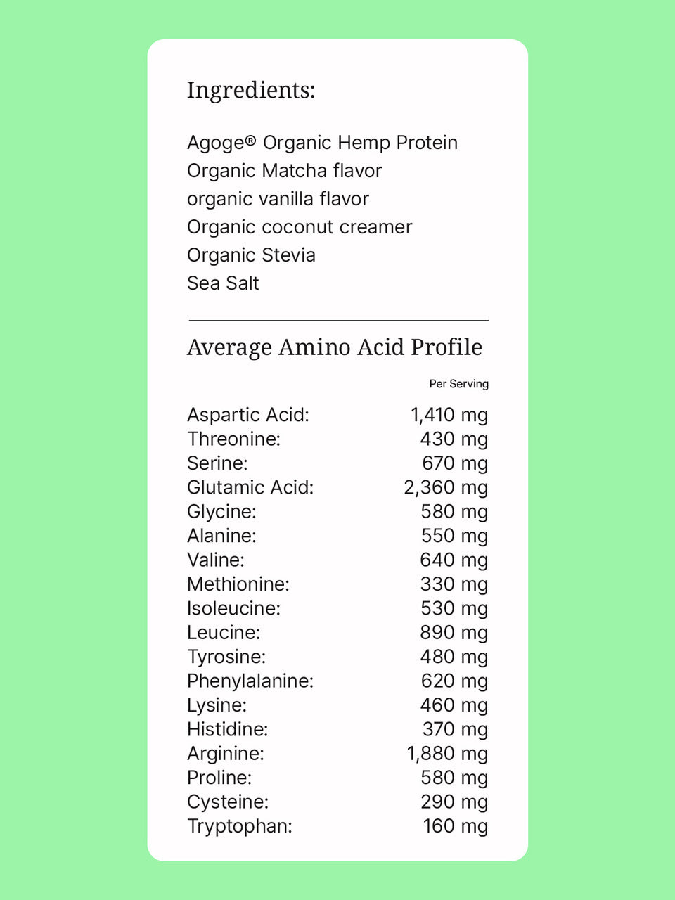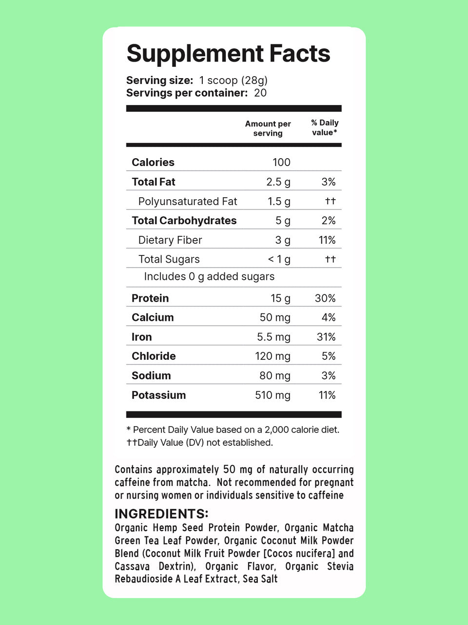 Organic Hemp Seed Protein Powder, Organic Matcha Green Tea Leaf Powder, Organic Natural Flavor, Organic Coconut Milk Powder Blend (Organic Coconut Milk Fruit Powder [Cocos Nucifera] and Organic Cassava Dextrin), Organic Flavor, Organic Stevia Leaf Extract (Rebaudioside A), Sea Salt.